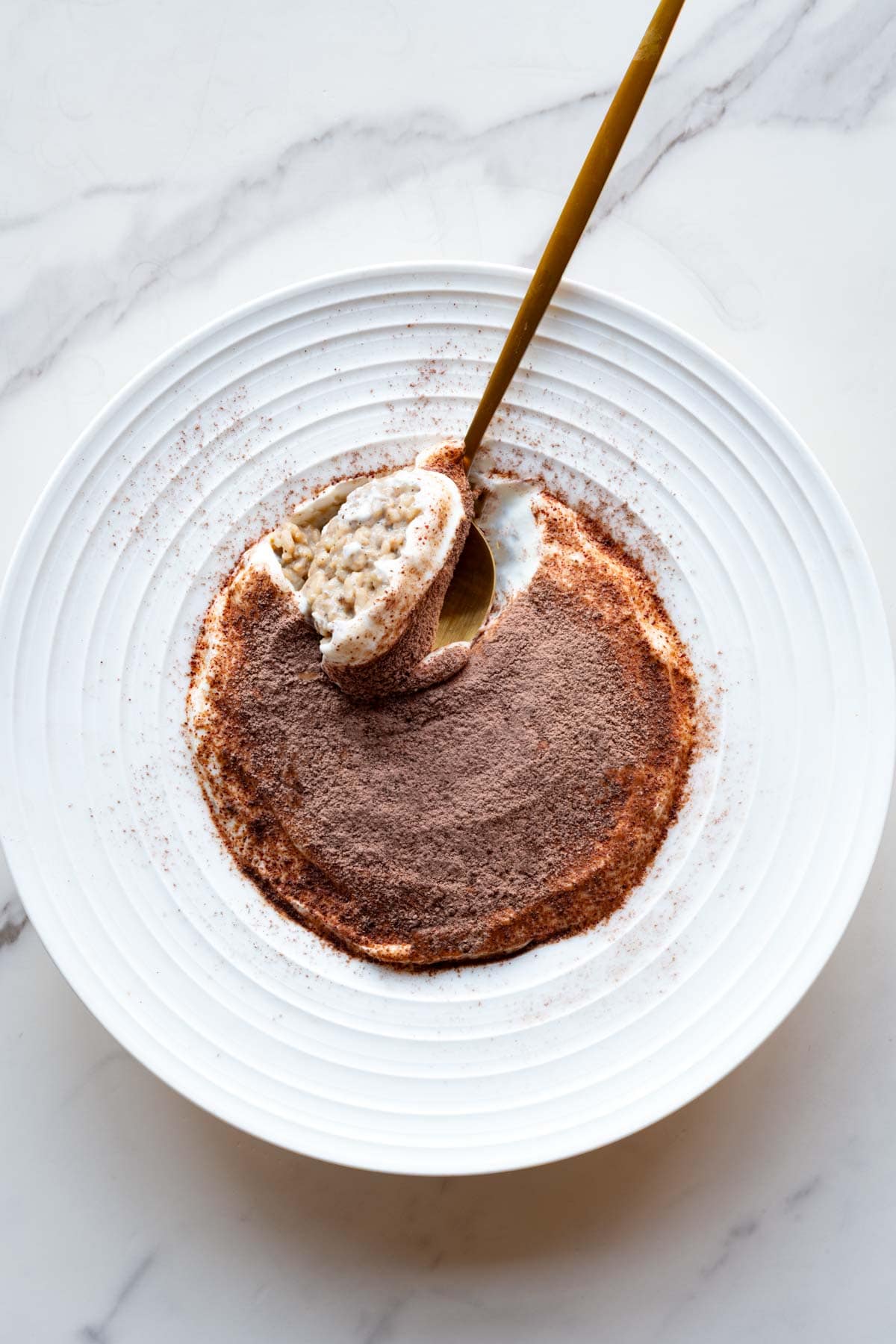 - Set aside to cool. Spread the yogurt evenly over the oats, then dust with cocoa powder using a fine-mesh sieve.